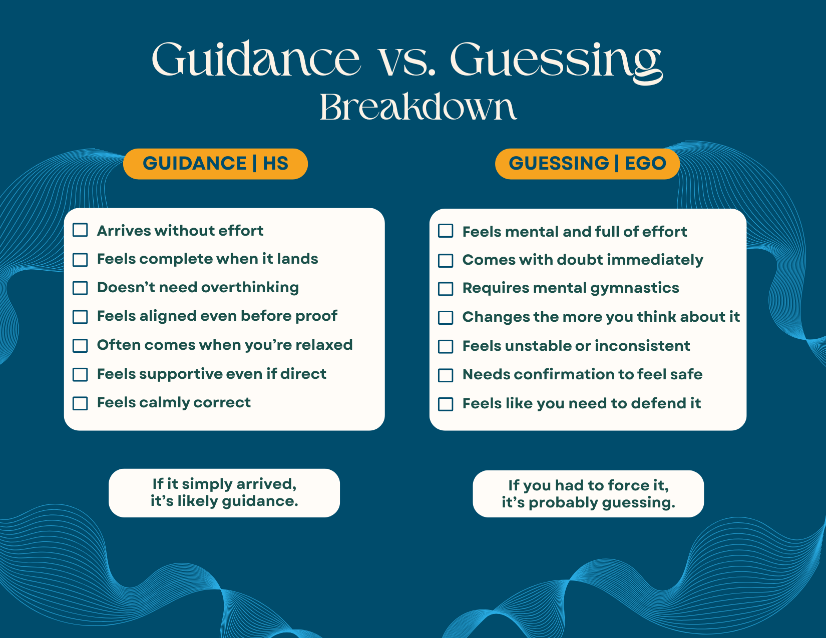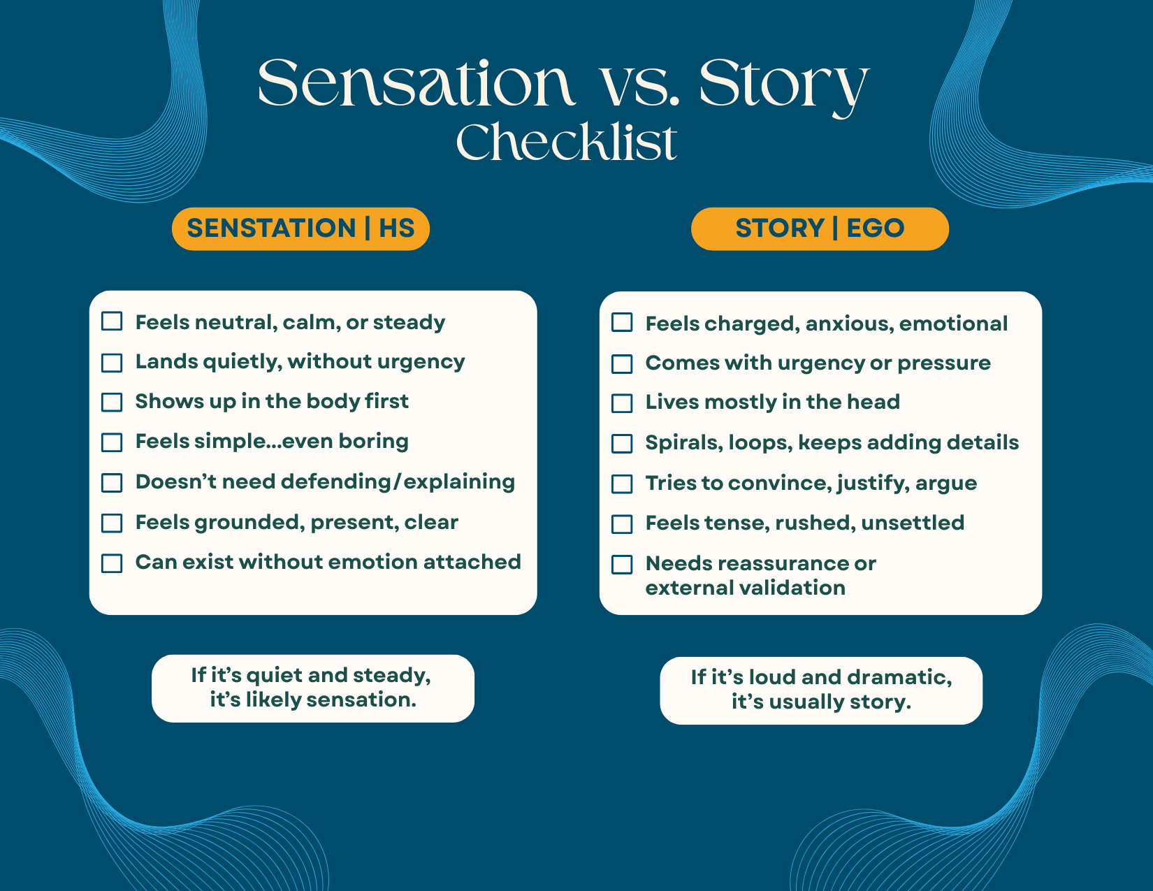 Made just for you, with my weird brain, are three checklists that will make a lot more sense after the Watch video in this wave. Tap or right click to save. Use them directly from your phone or print them out and hang them up to use when learning to tell the difference between your Ego and your Higher Self.